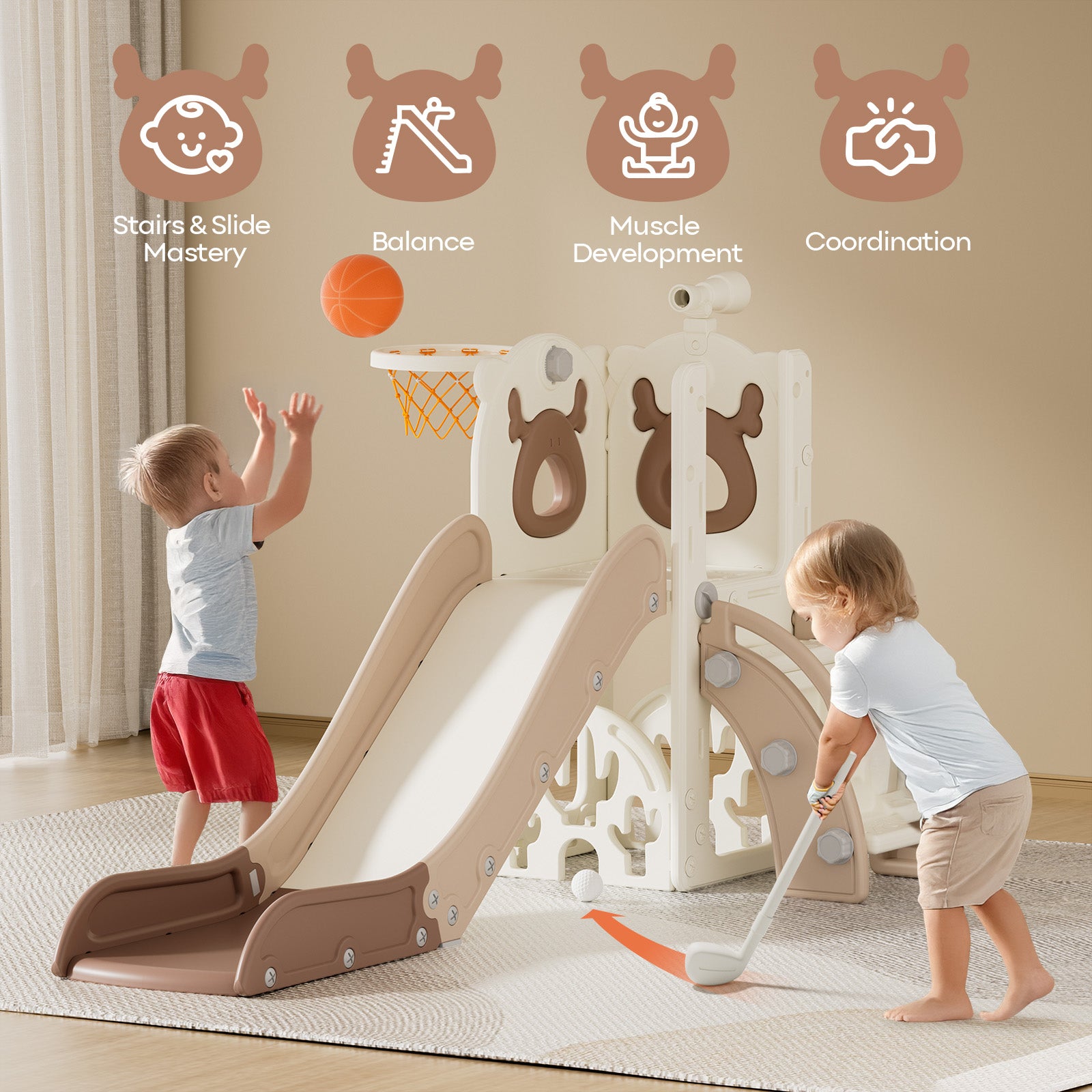 7 in 1 Toddler Slide, Kids Slide for Toddlers 1-3 Years Old, Baby Slide Indoor and Outdoor with Basketball Hoop Upgraded Golf, Plastic Slides for Kids Easy Assembly Elk Theme(27.5×62.2×38.9")