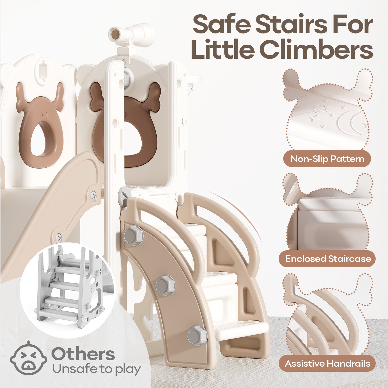 【Safe and Sturdy Material】 Crafted with non-toxic and sturdy HDPE, Passed ASTM Testing, CPSIA and CPC Certified; Maximum load capacity up to 155 pounds; Smooth edges, anti-slip and no large hole design offer worry-free play for kids aged 1+
